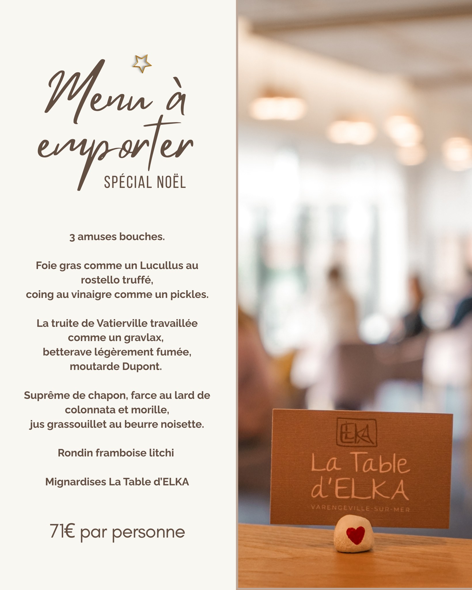 - La Table d’Elka (Varengeville-sur-Mer) : Menu de Noël à 71 €